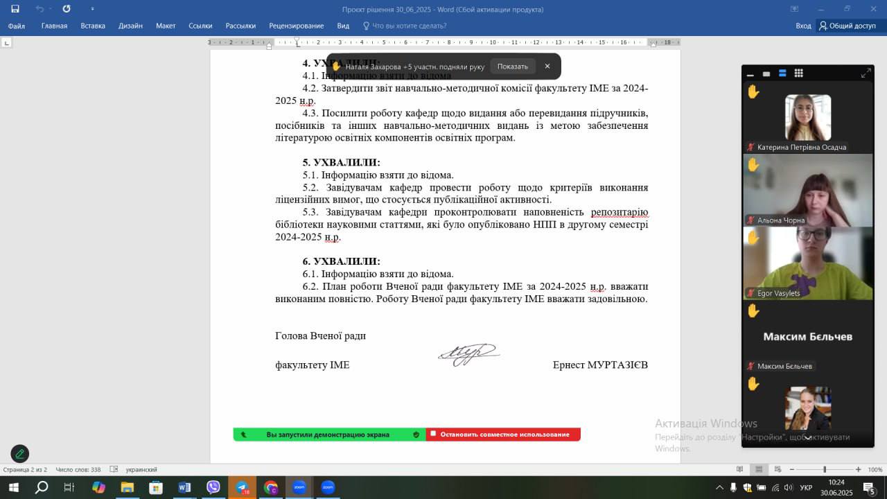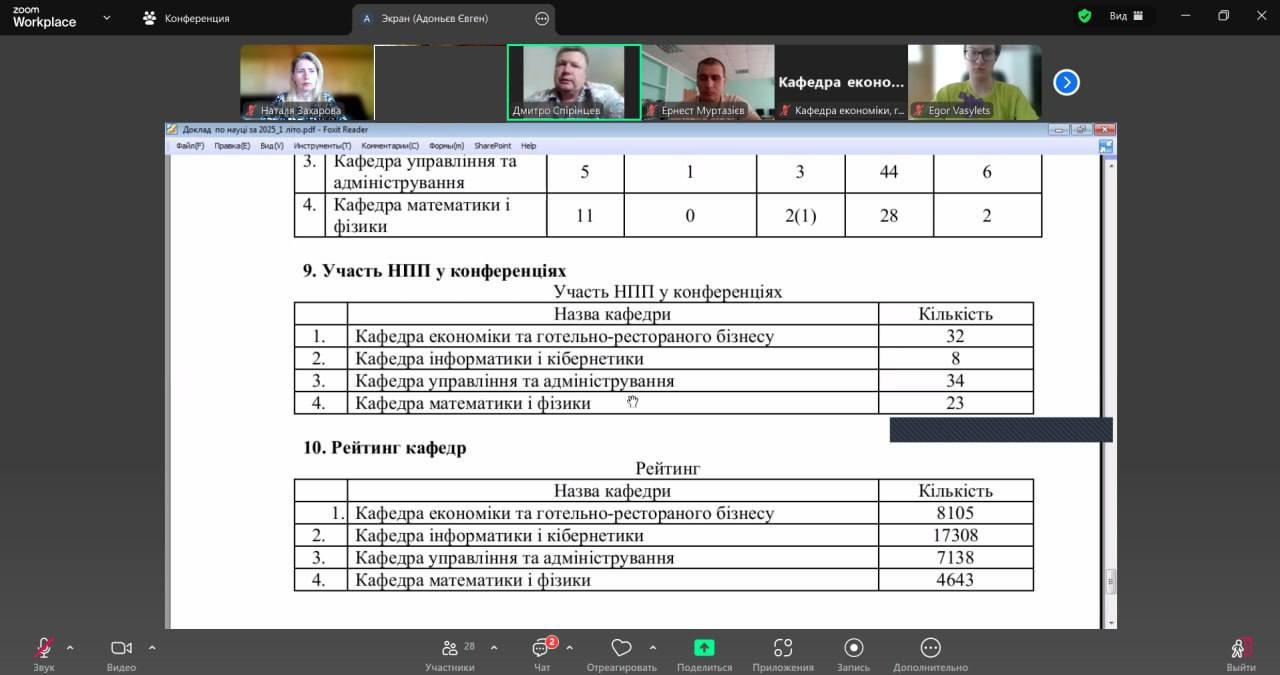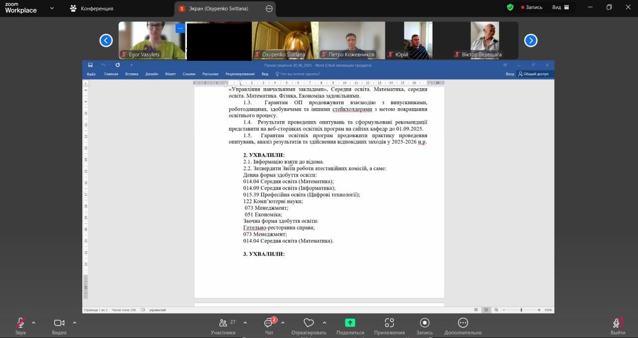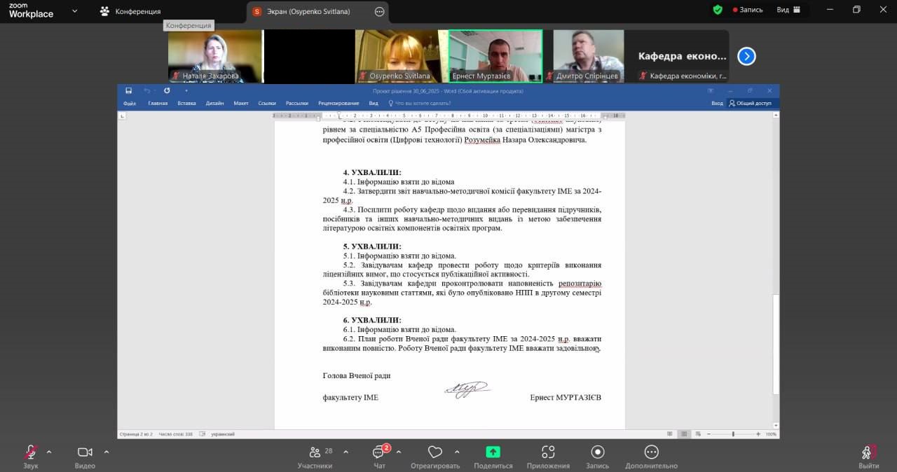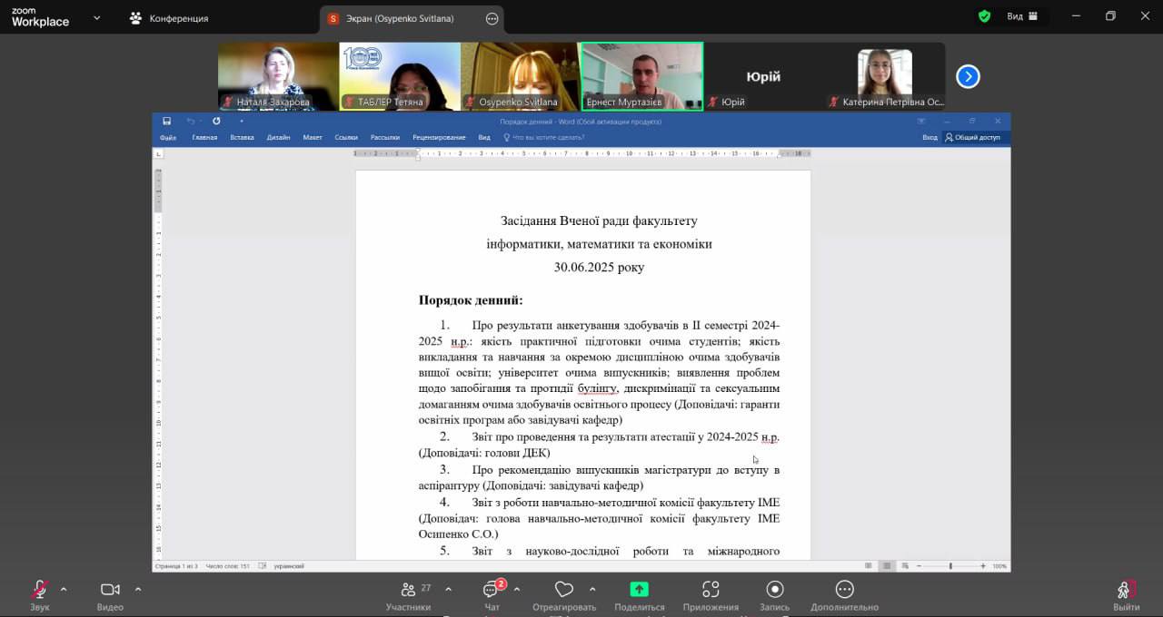 30 червня 2025 року на факультеті інформатики, математики та економіки відбулося чергове засідання Вченої ради. На порядку денному були розглянуті наступні питання: