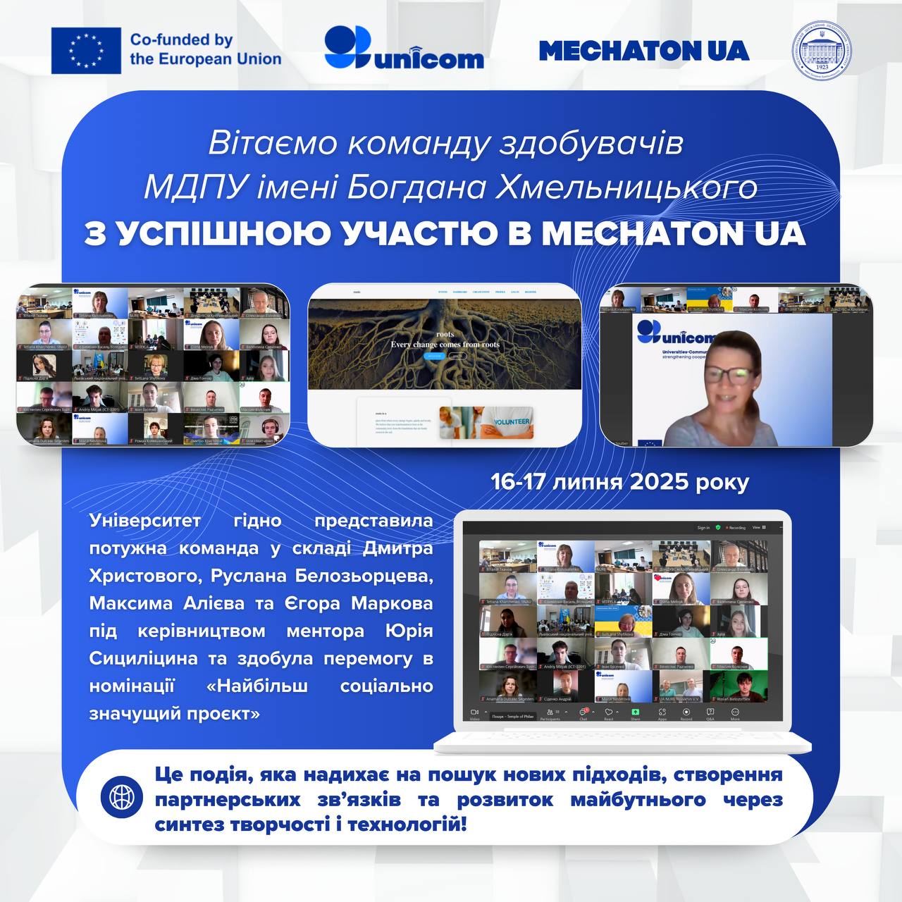 🎓💫 16-17 липня команда МДПУ імені Богдана Хмельницького у складі Дмитра Христового, Руслана Белозьорцева, Максима Алієва і Єгора Маркова взяла участь у Мекатон UA і перемогла у номінації “Найбільш соціально значущий проєкт”.