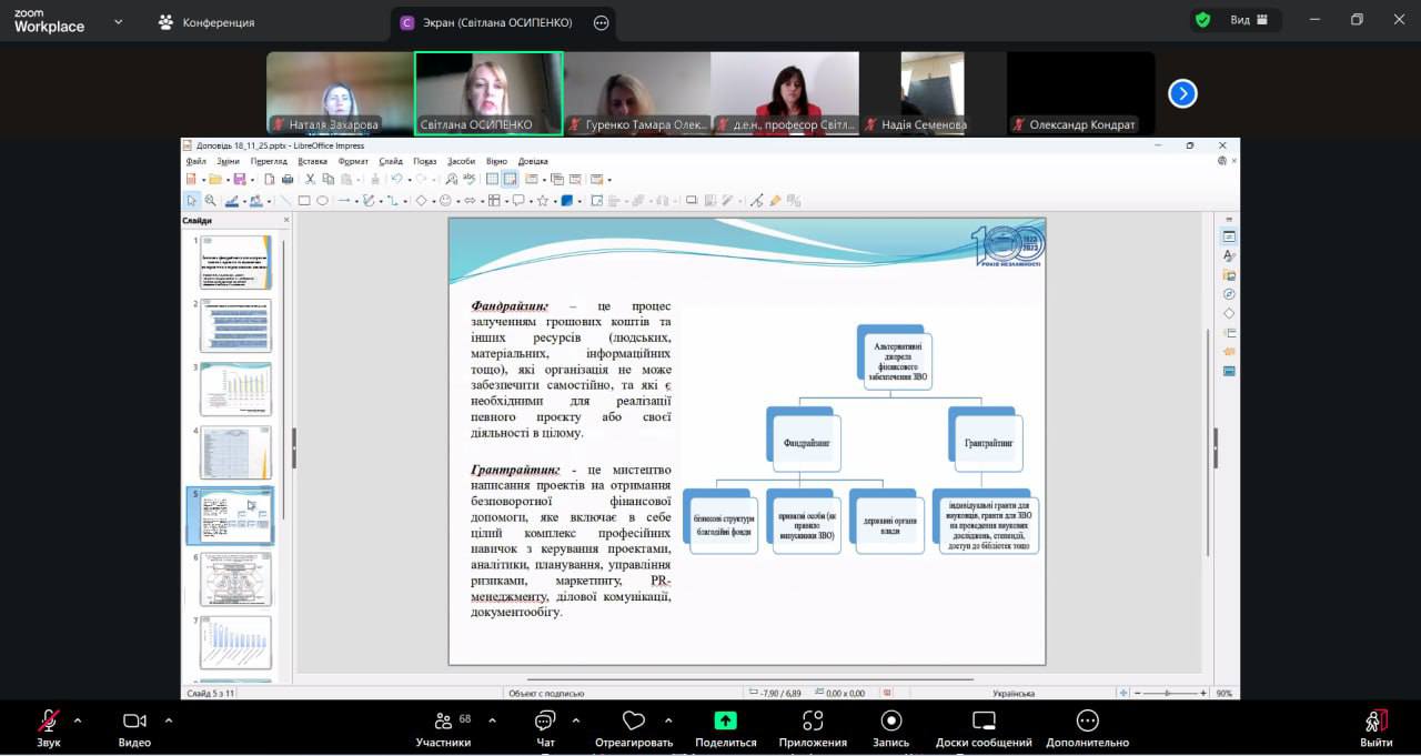 Захід об’єднав фахівців з провідних закладів вищої освіти України , Польщі та Індії. На пленарному засіданні були представлені доповіді, що охоплюють питання стратегічного планування діяльності підприємств в умовах сучасних викликів, євроінтеграційної трансформації регуляторного середовища підприємницької діяльності в Україні, концептуального підходу щодо сталого розвитку територій та громад в Україні в умовах війни тощо. Завідувачка кафедри управління та адміністрування, доцентка Світлана ОСИПЕНКО представила доповідь на тему «Значення фандрайзингу для підтримки освітніх проєктів та відновлення університетів у період воєнних викликів», яка викликала жвавий інтерес у наукової спільноти.
