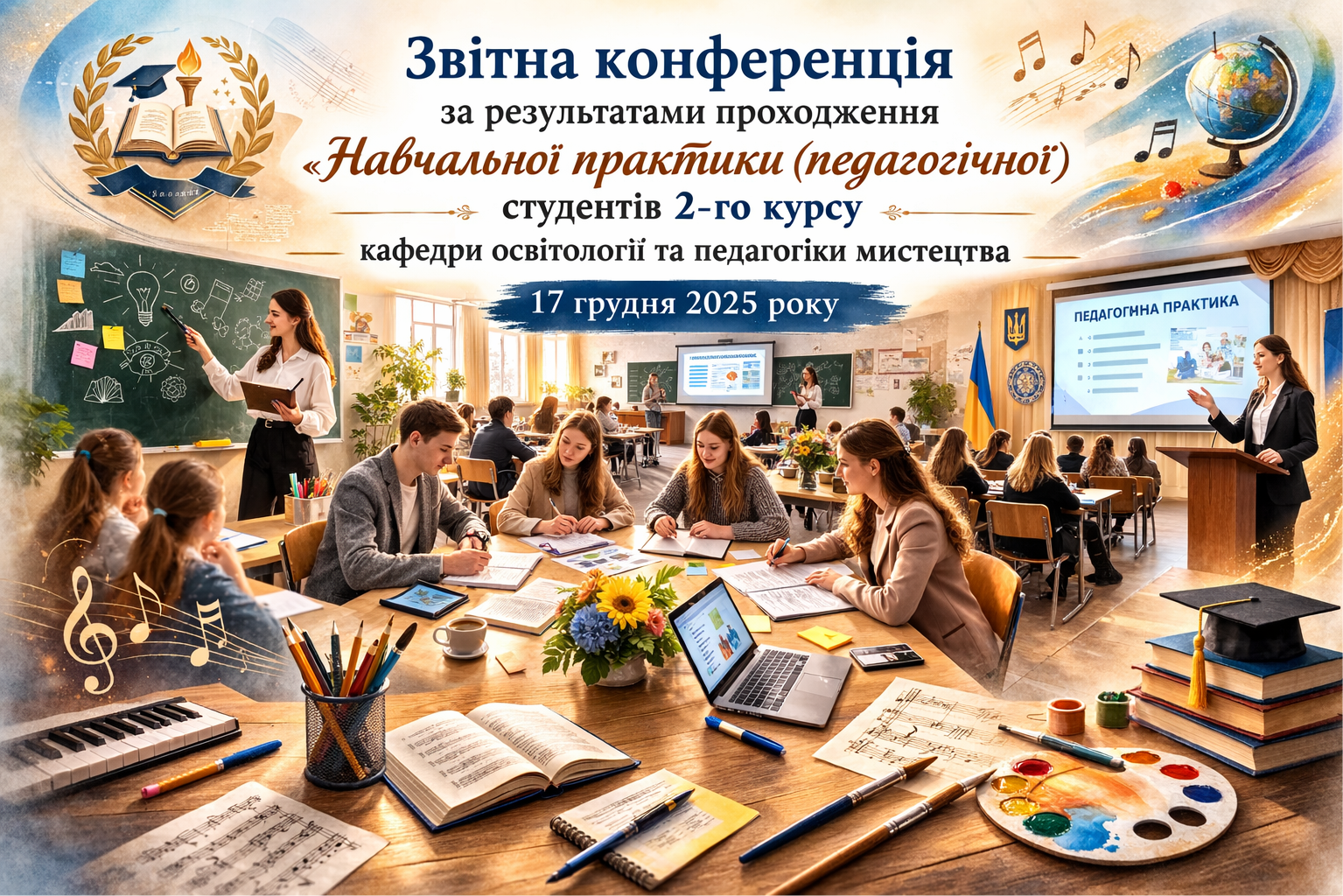 17 грудня 2025 року на кафедрі освітології та педагогіки мистецтва відбулася звітна конференція за результатами проходження «Навчальної практики (педагогічної)», яка є складовим модулем 5 освітнього компоненту «Педагогіка» для студентів 2-го курсу.