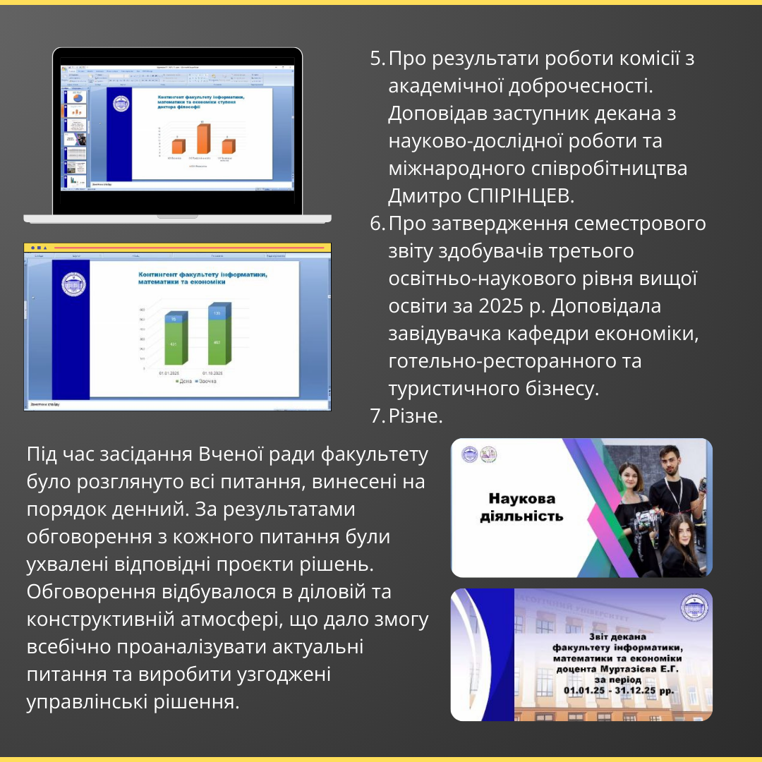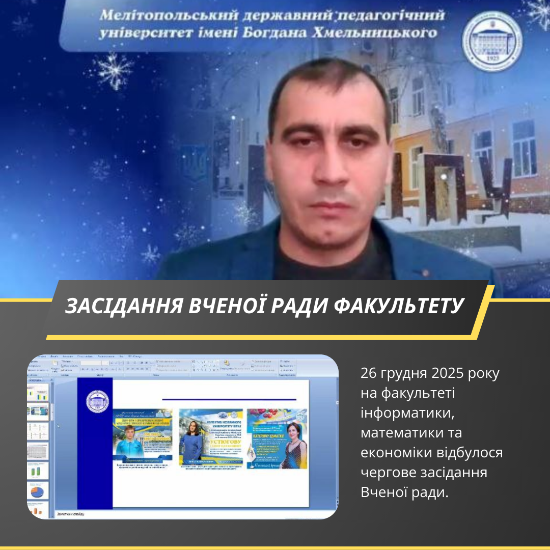 26 грудня 2025 року на факультеті інформатики, математики та економіки відбулося чергове засідання Вченої ради. На порядку денному були розглянуті наступні питання: