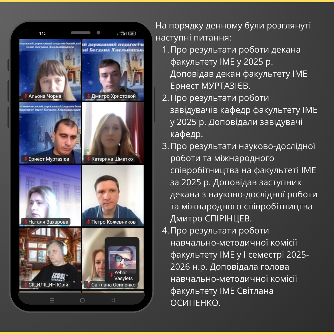 - Про результати роботи завідувачів кафедр факультету ІМЕ у 2025 р. Доповідали завідувачі кафедр.