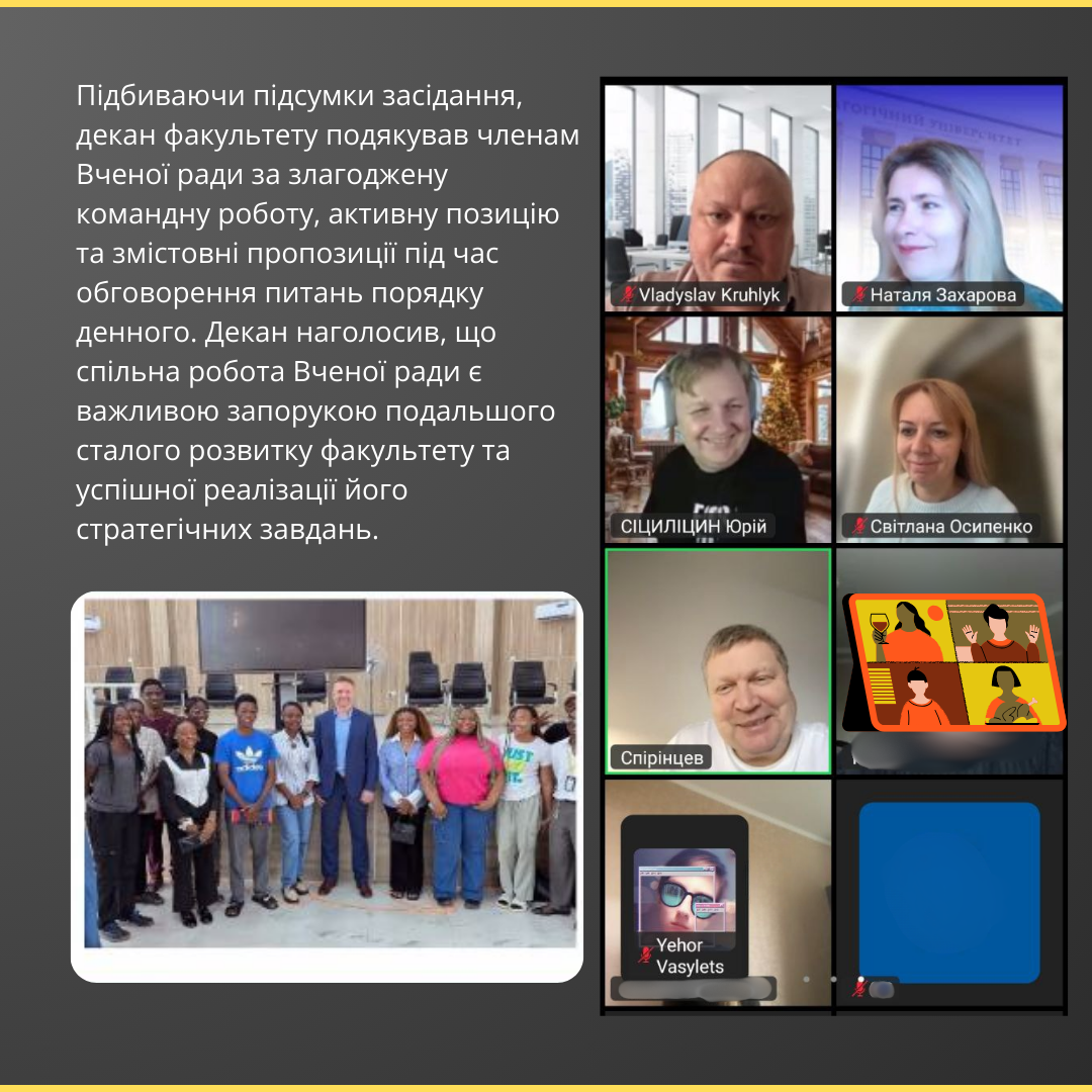 Підбиваючи підсумки засідання, декан факультету подякував членам Вченої ради за злагоджену командну роботу, активну позицію та змістовні пропозиції під час обговорення питань порядку денного. Декан наголосив, що спільна робота Вченої ради є важливою запорукою подальшого сталого розвитку факультету та успішної реалізації його стратегічних завдань.