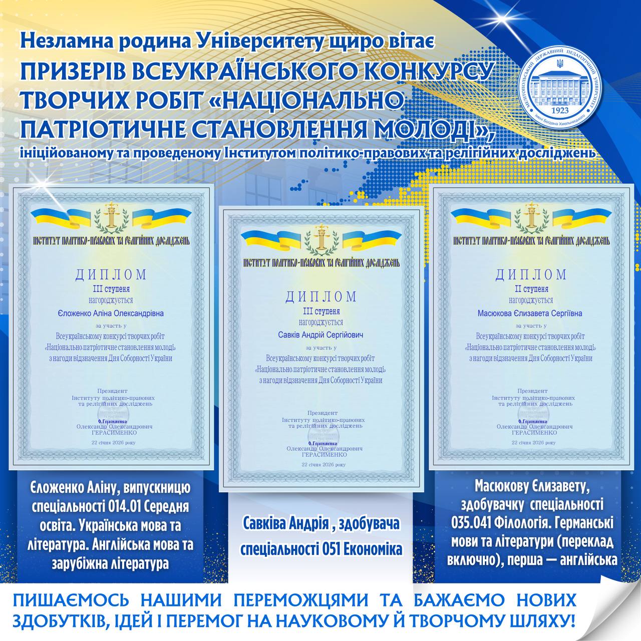 👏🏻👥 Незламна родина МДПУ імені Богдана Хмельницького продовжує вітати своїх здобувачів освіти й випускників, які гідно представили університет на Всеукраїнському конкурсі творчих робіт «Національно-патріотичне становлення молоді», приуроченому до відзначення Дня Соборності України.