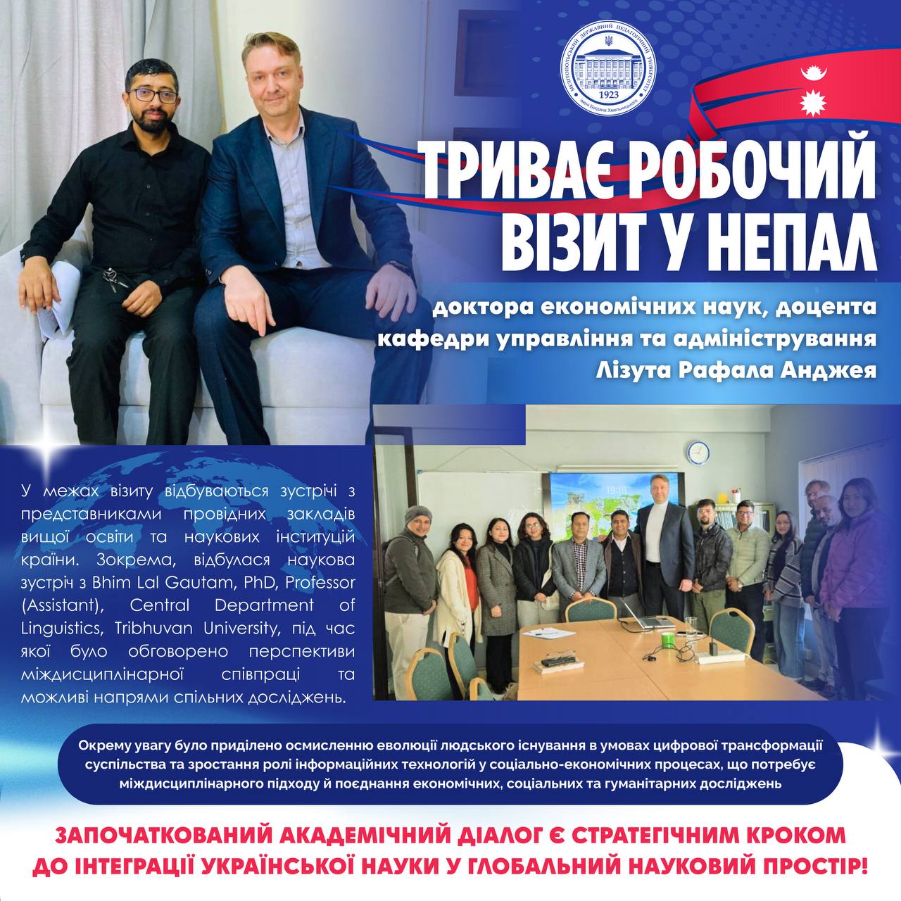 📌 Доктор економічних наук, доцент кафедри управління та адміністрування Мелітопольського державного педагогічного університету імені Богдана Хмельницького Лізут Рафал Анджей перебуває з робочим візитом у Непал з метою розширення міжнародних академічних зв’язків та розвитку міжуніверситетської співпраці. У межах візиту відбуваються зустрічі з представниками провідних закладів вищої освіти та наукових інституцій країни.