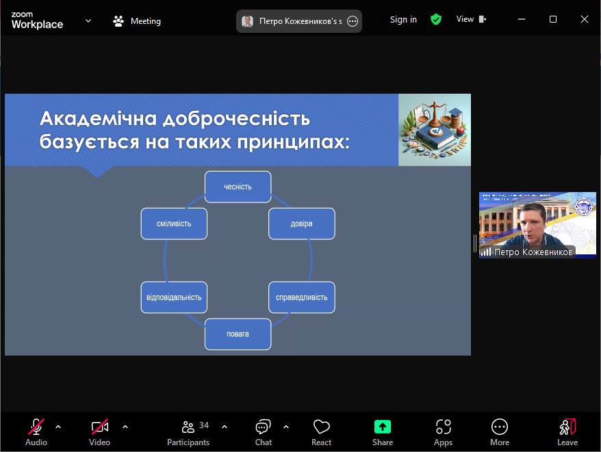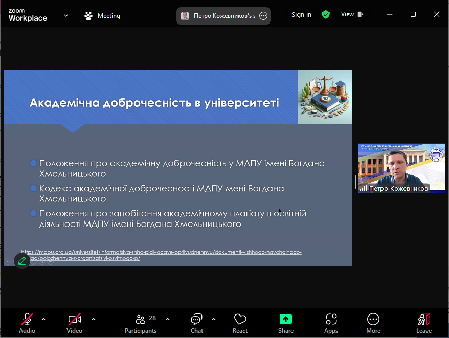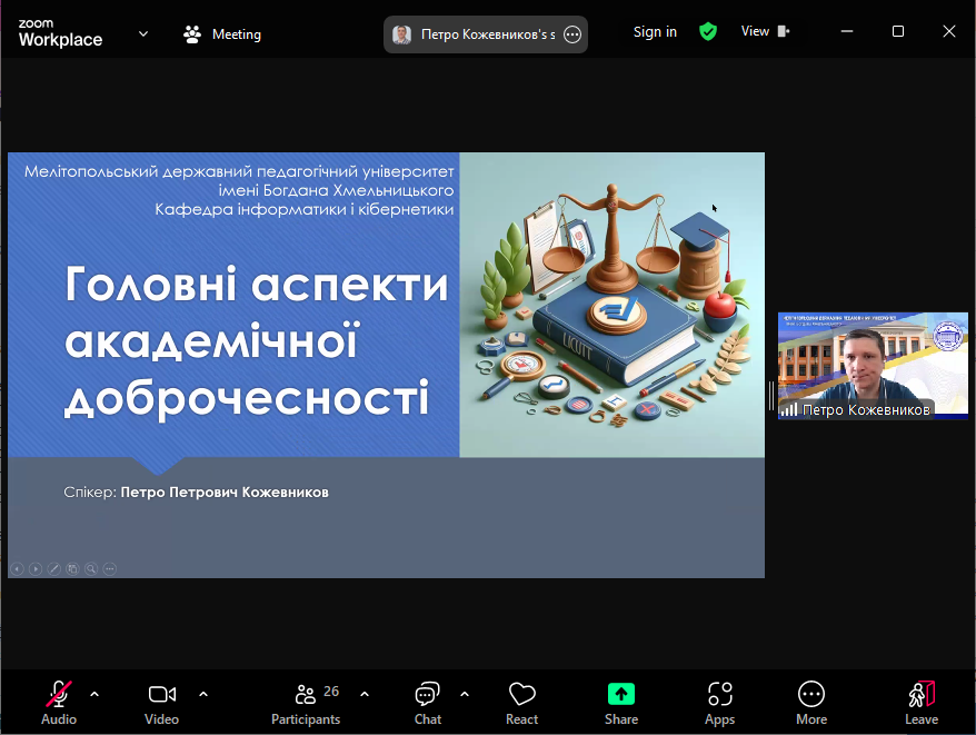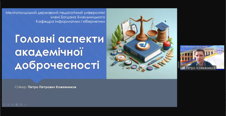 Спікер ознайомив учасників з документами, які визначають політику щодо академічної доброчесності в МДПУ імені Богдана Хмельницького, розповів про види порушень академічної доброчесності та їхні можливі наслідки, форми відповідальності у випадку виявлення таких порушень, наголосив на необхідності взаємодії з викладачами у випадку виникнення спірних питань. Також було розглянуто окремі аспекти відповідально використання генеративного штучного інтелекту в освітньому процесі.
