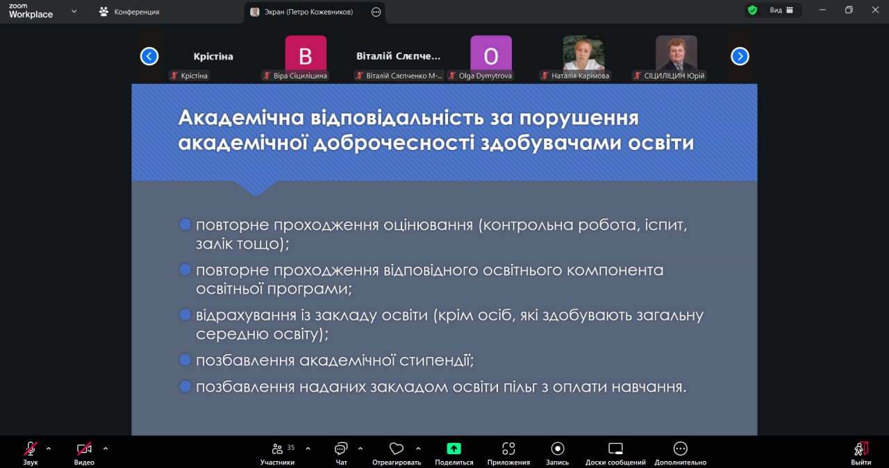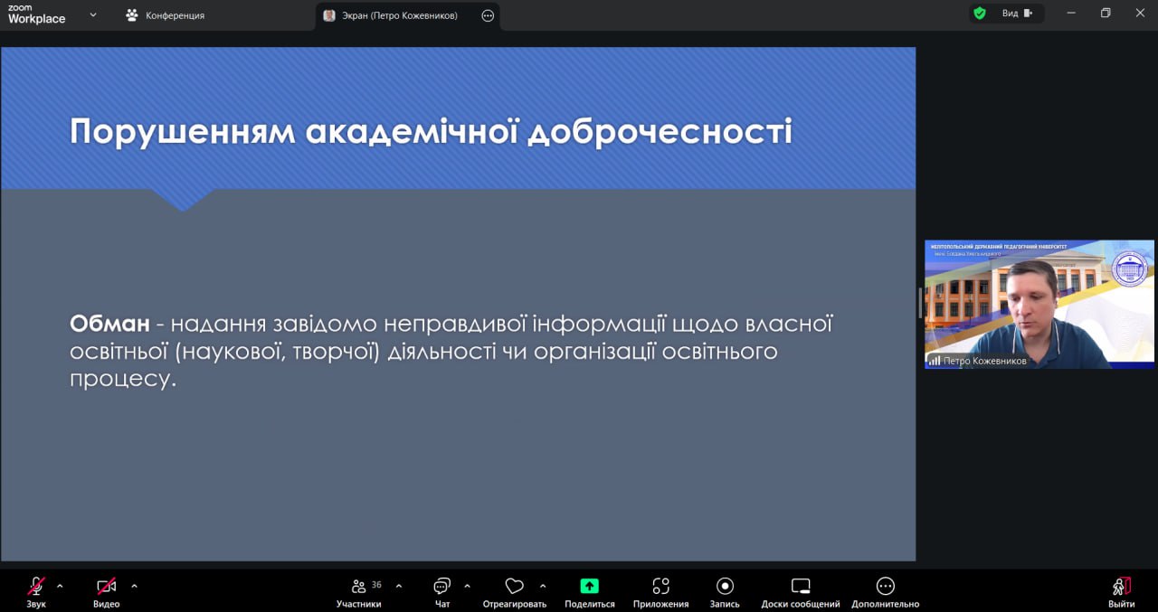 Спікером заходу став Петро КОЖЕВНИКОВ, який висвітлив фундаментальні засади академічної доброчесності, підкреслив її роль у забезпеченні якості освіти та значення для професійного становлення здобувачів освіти.