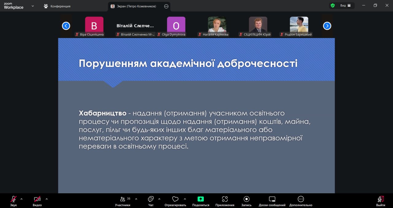 Учасники заходу долучилися до активної дискусії щодо викликів, які постають перед закладами освіти у контексті забезпечення академічної доброчесності. Окремий акцент було зроблено на формуванні культури відповідального ставлення до навчання, необхідності дотримання принципів академічної доброчесності під час підготовки курсових і кваліфікаційних робіт, а також на важливості самостійного здобуття знань.