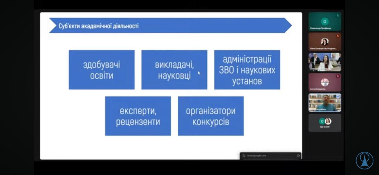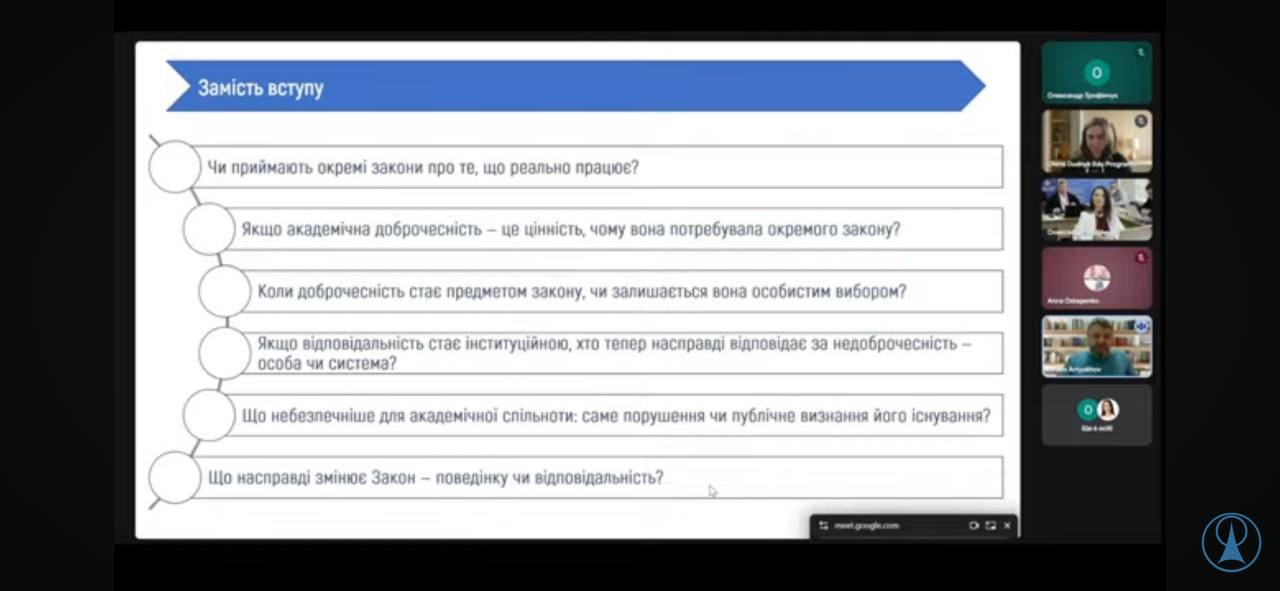 Під час проведення зустрічі було зосереджено увагу на таких питаннях: роль принципів академічної доброчесності в освітній і науковій діяльності; актуальні проблеми плагіату та механізми його попередження; відповідальність учасників освітнього процесу за дотримання етичних стандартів; застосування сучасних цифрових інструментів для перевірки навчальних і наукових робіт; нормативно-правове регулювання у сфері академічної доброчесності.