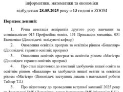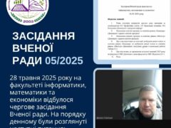 28 травня 2025 року на факультеті інформатики, математики та економіки відбулося чергове засідання Вченої ради. На порядку денному були розглянуті наступні питання: Річна атестація аспірантів другого року навчання за спеціальністю...