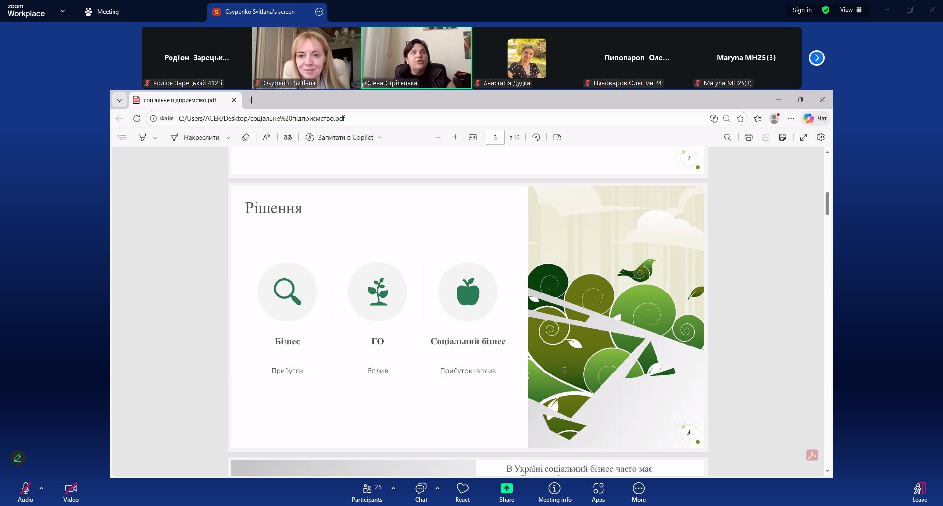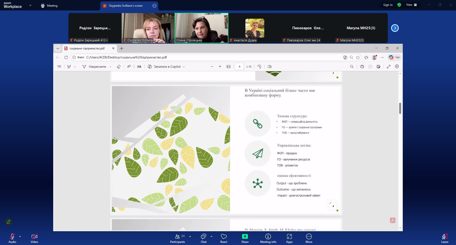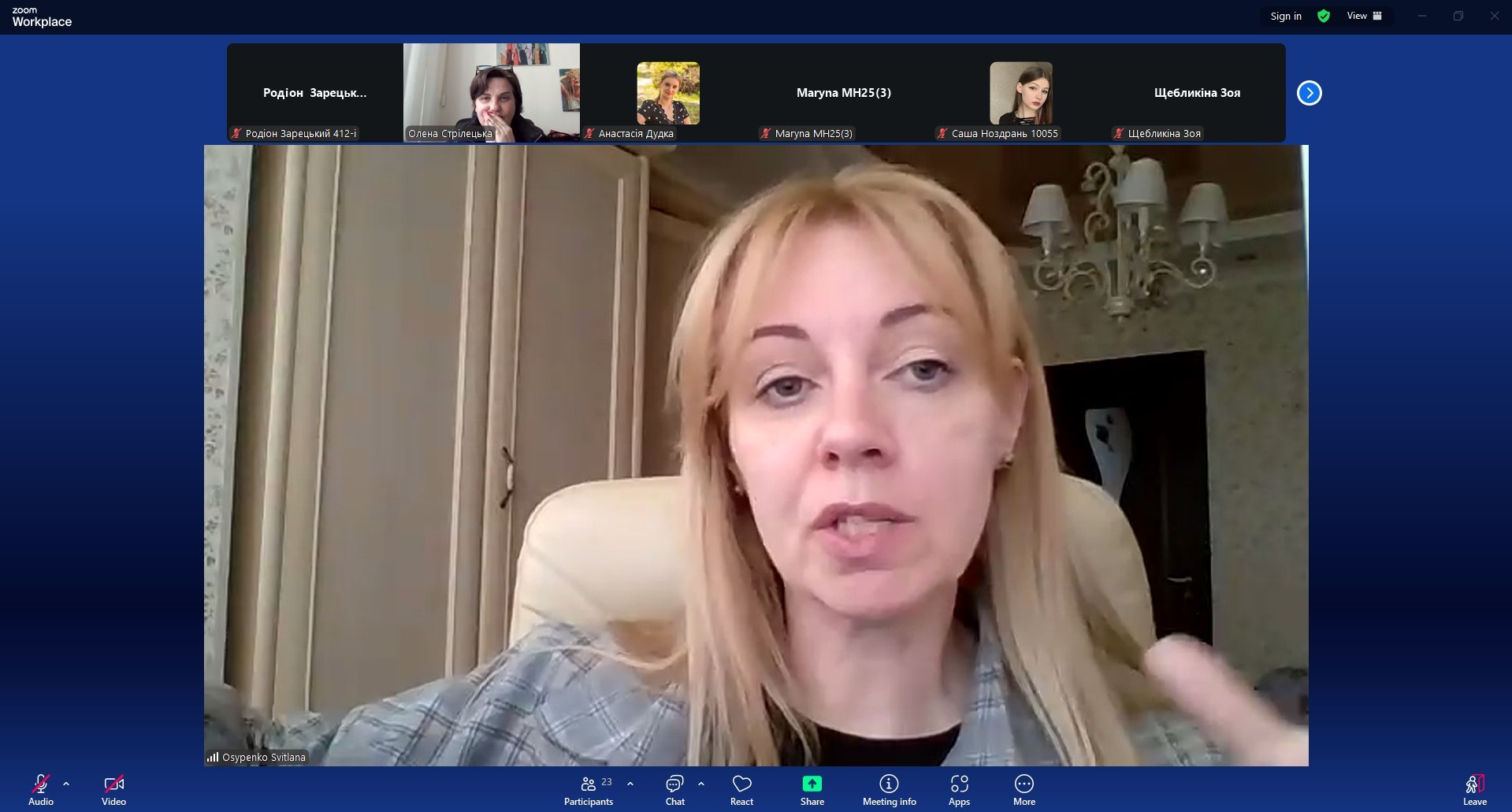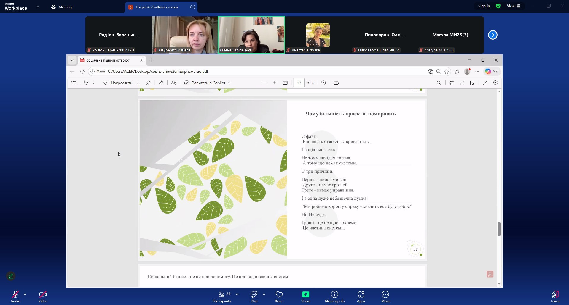 Колектив кафедри управління та адміністрування висловлює щиру подяку пані Олені за змістовну, структуровану та практично орієнтовану доповідь. Представлений матеріал дозволив глибше зрозуміти сутність соціального підприємництва, його можливості та виклики, а також отримати цінні інструменти для розробки власних проєктів