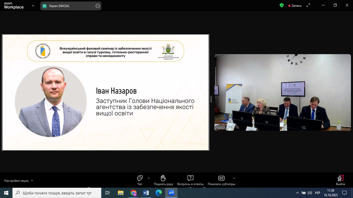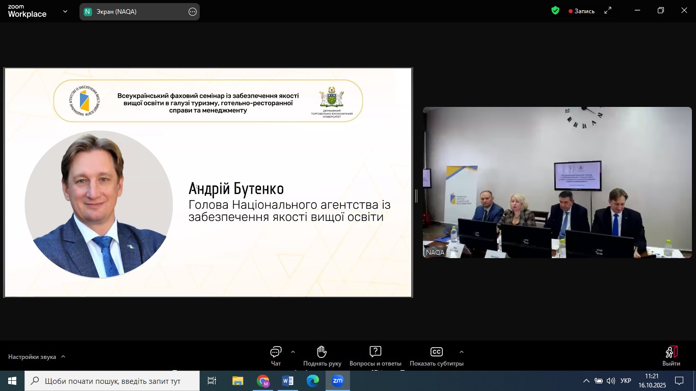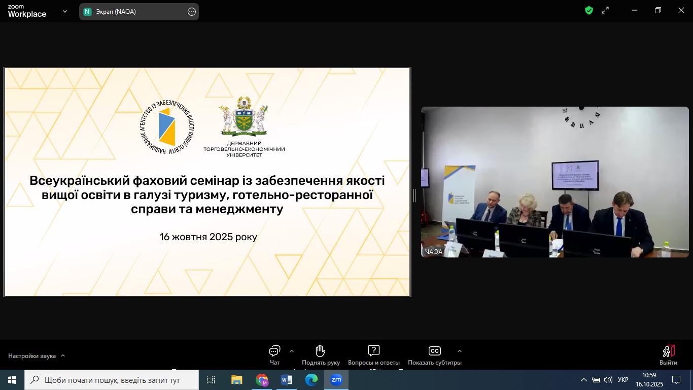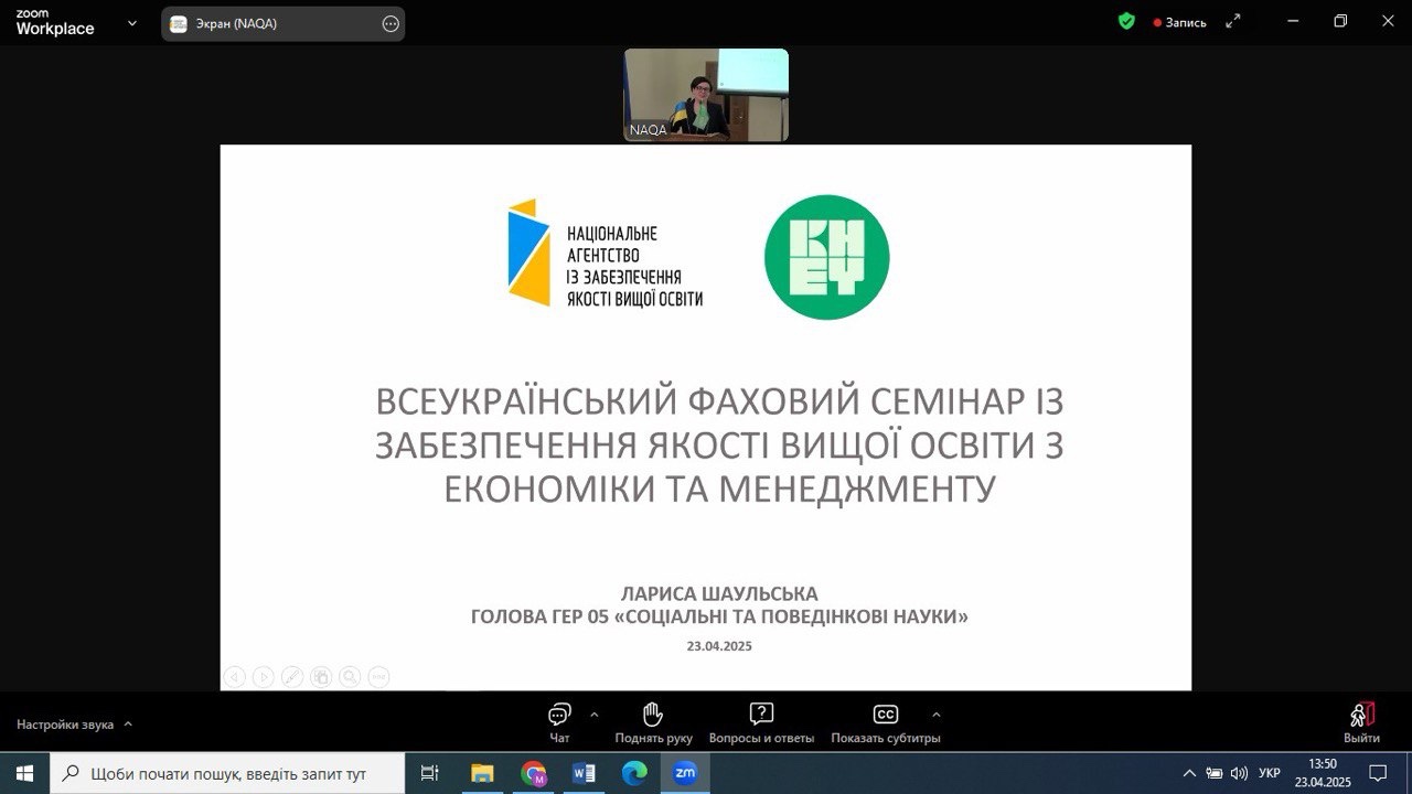 23 квітня 2025 року НПП кафедри економіки, готельно-ресторанного та туристичного бізнесу взяли участь у Всеукраїнському фаховому семінарі з питань забезпечення якості вищої освіти в галузі економіки та менеджменту, організованому Національним агентством із забезпечення якості вищої освіти. Захід відбувся на базі Київського національного економічного університету імені Вадима Гетьмана у змішаному форматі та об’єднав понад 400 учасників.