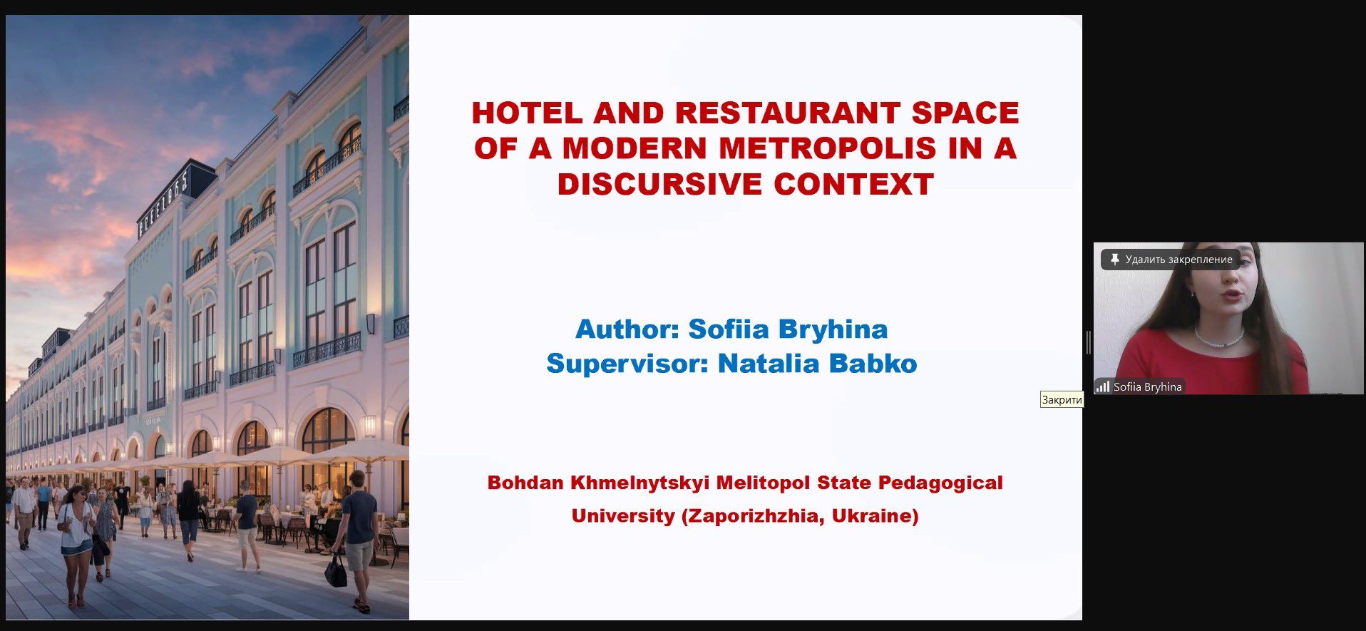 🔬 Тема конкурсної роботи: “Готельно-ресторанний простір сучасного мегаполісу в дискурсивному контексті”. Дослідження здобувачки проводилось на базі Науково-освітньої лабораторії Готельно-ресторанного та туристичного бізнесу Мелітопольського державного педагогічного університету імені Богдана Хмельницького та присвячене ролі готельно-ресторанної індустрії у формуванні міського середовища, з особливим акцентом на соціокультурні та інноваційні аспекти.