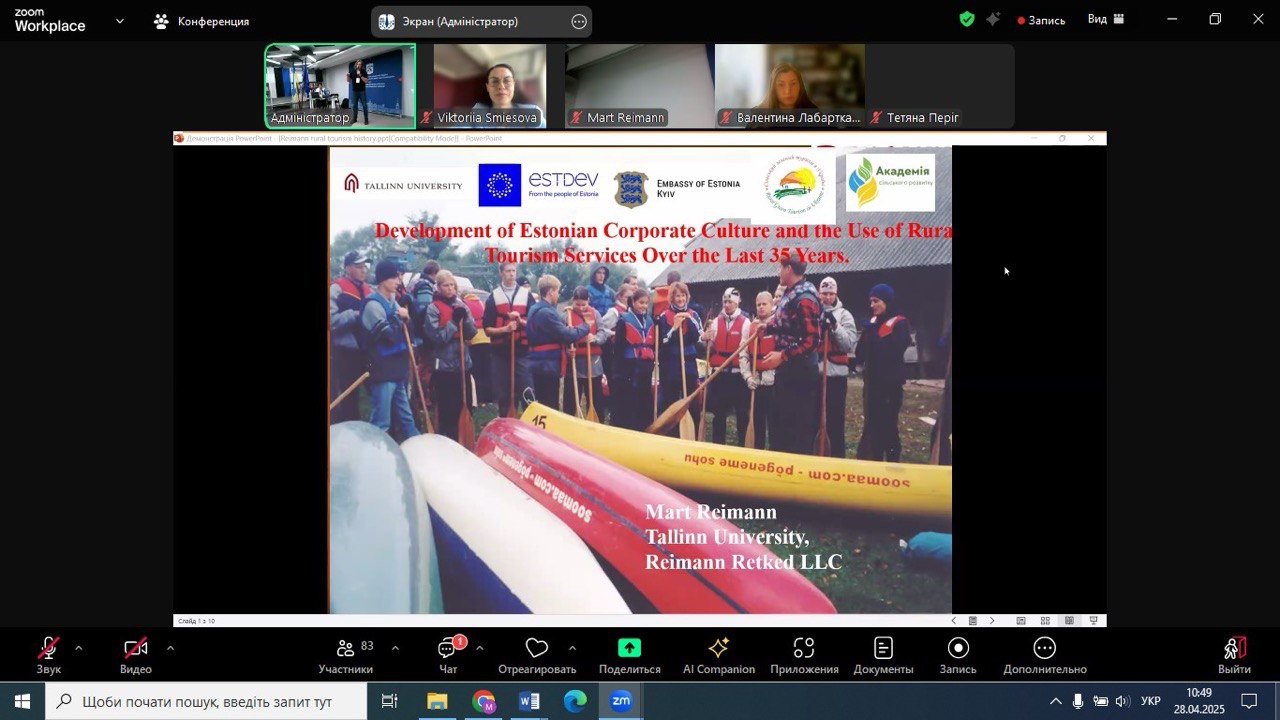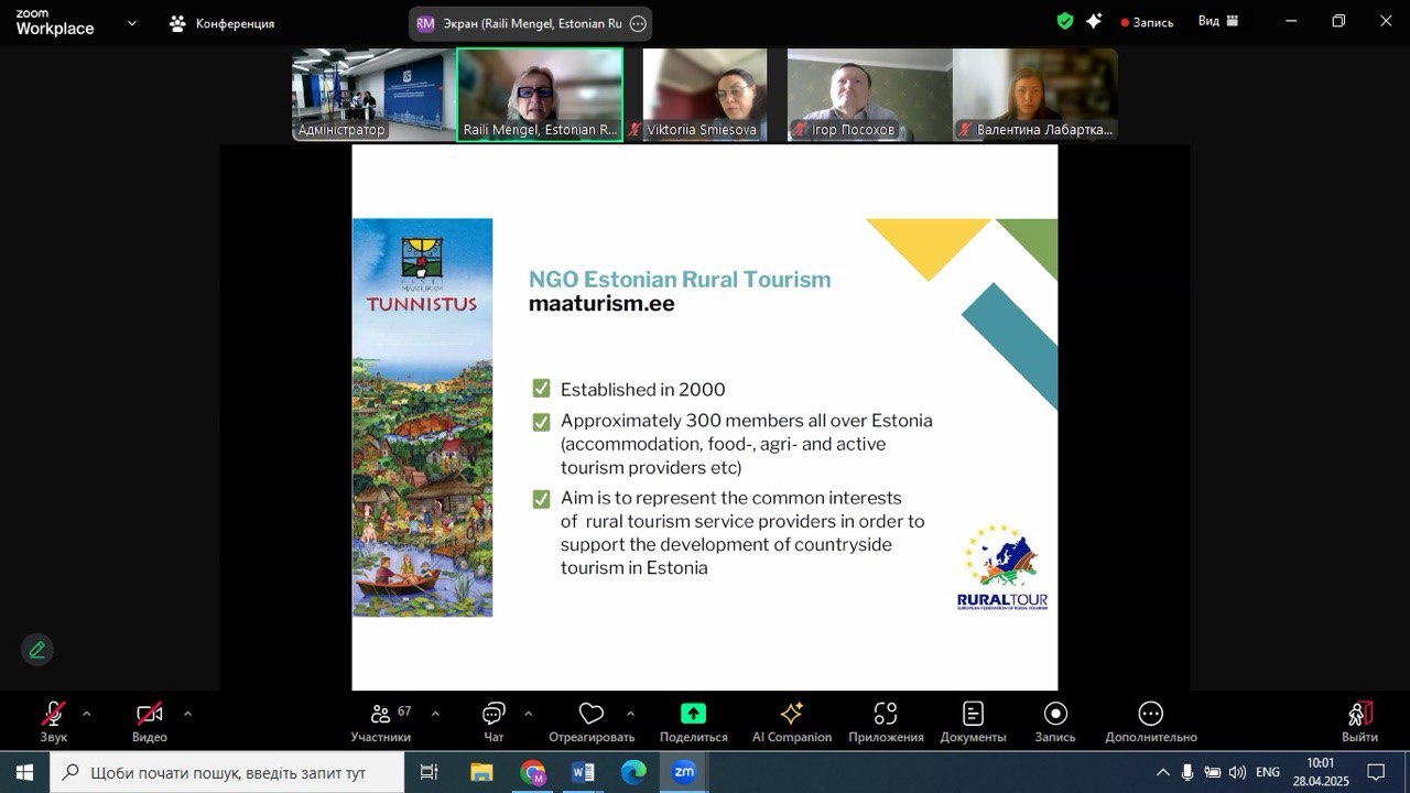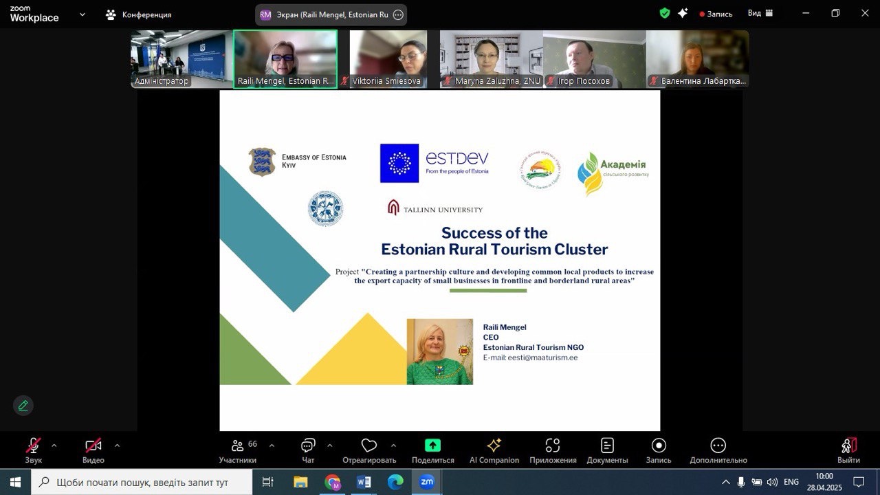 28.04.2025 року НПП кафедри економіки, готельно-ресторанного та туристичного бізнесу, в рамках членства Спілки сільського зеленого туризму України, взяли участь у підсумковій конференції «Партнерство як інструмент експорту локального продукту з сільських територій України» міжнародного проєкту «Створення культури партнерства та розвиток спільних місцевих продуктів для підвищення експортної спроможності малого бізнесу на прифронтових та прикордонних сільських територіях» за фінансової підтримки Естонського центру міжнародного розвитку.