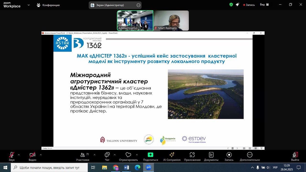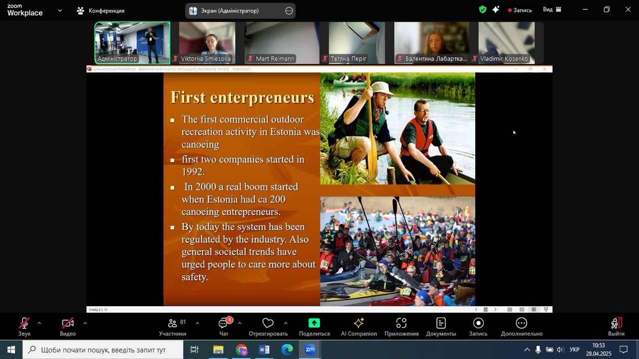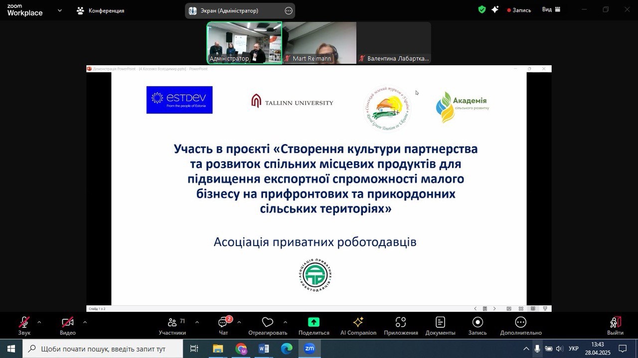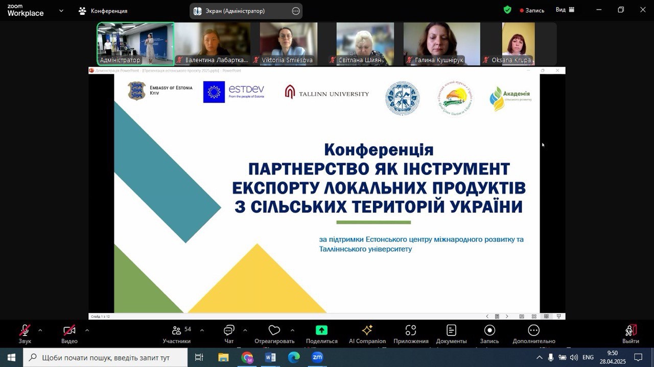 28.04.2025 року НПП кафедри економіки, готельно-ресторанного та туристичного бізнесу, в рамках членства Спілки сільського зеленого туризму України, взяли участь у підсумковій конференції «Партнерство як інструмент експорту локального продукту з сільських територій України» міжнародного проєкту «Створення культури партнерства та розвиток спільних місцевих продуктів для підвищення експортної спроможності малого бізнесу на прифронтових та прикордонних сільських територіях» за фінансової підтримки Естонського центру міжнародного розвитку.