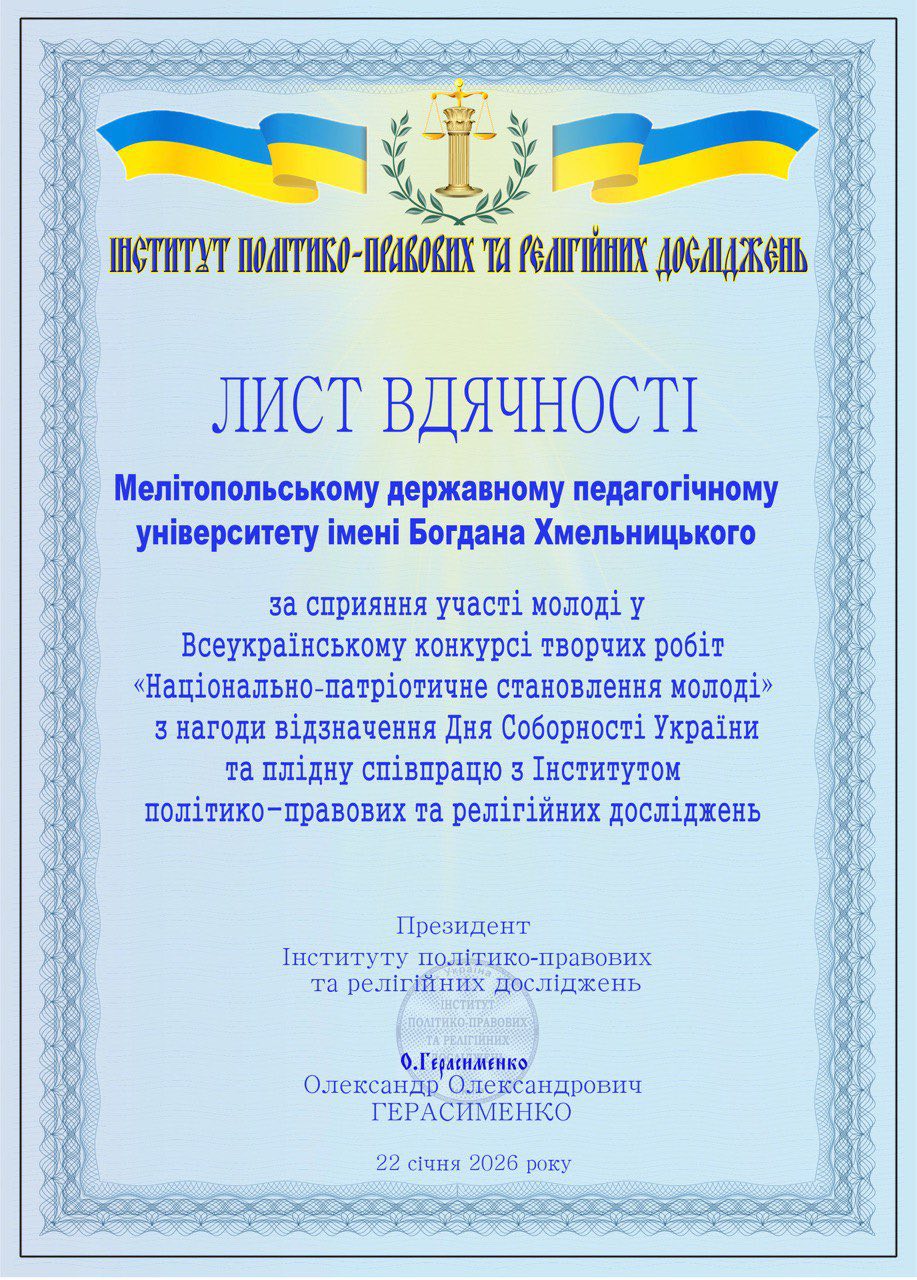 Мелітопольському державному педагогічному університету імені Богдана Хмельницького за сприяння участі молоді у Всеукраїнському конкурсі творчих робіт «Національно-патріотичне становлення молоді» з нагоди відзначення Дня Соборності України та плідну співпрацю з Інститутом політико-правових та релігійних досліджень.