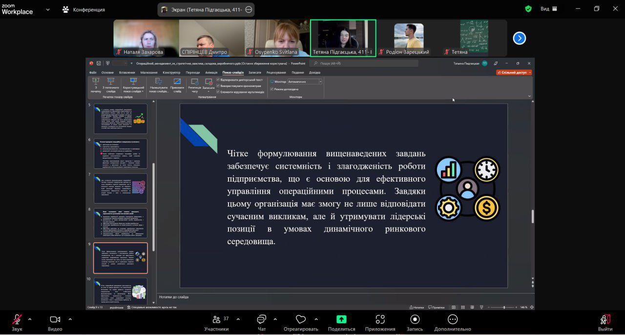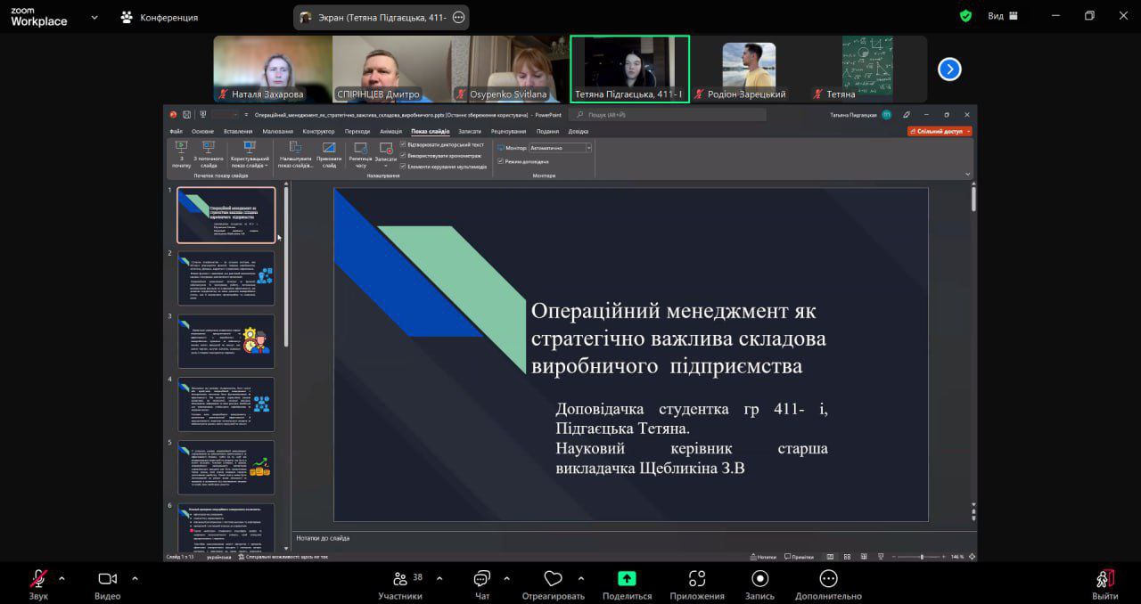 Підгаєцька Тетяна, здобувачка групи 411-і, презентувала доповідь «Операційний менеджмент як стратегічно важлива складова виробничого підприємства» (науковий керівник – ст. викладачка Щебликіна З.В.). У виступі було акцентовано на ролі операційного менеджменту у забезпеченні конкурентоспроможності та ефективності функціонування виробничих структур.