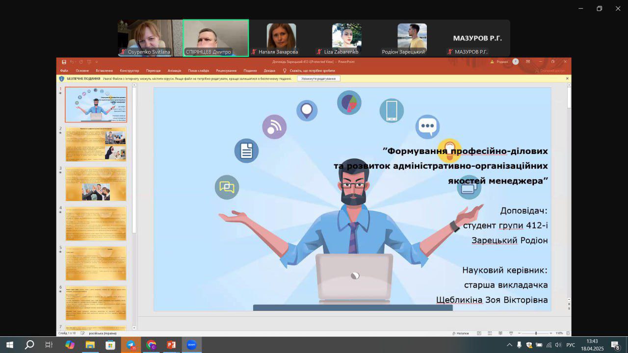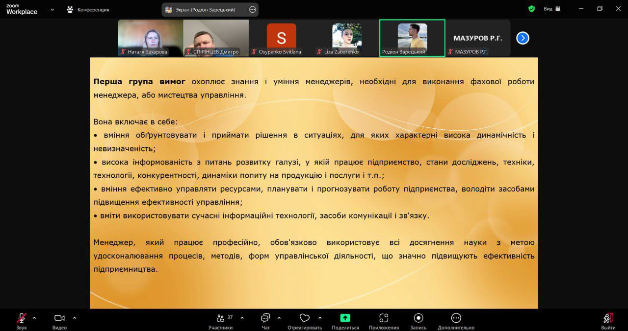 Зарецький Родіон, здобувач групи 412-і, у своїй доповіді «Формування професійно-ділових та розвиток адміністративно-організаційних якостей менеджера» (науковий керівник – ст. викладачка Щебликіна З.В.) розглянув ключові особистісні та професійні характеристики сучасного управлінця, а також фактори, що впливають на їх формування в процесі навчання і практики.
