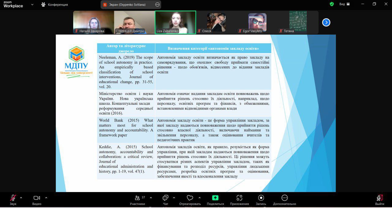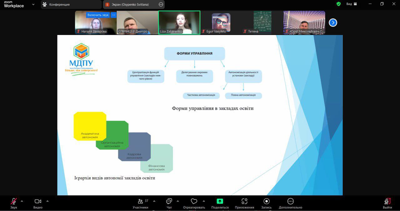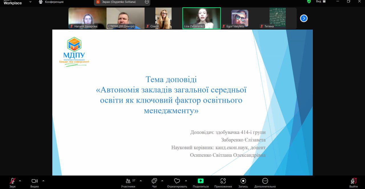 Забаренко Єлизавета, здобувачка групи 414-і, представила доповідь «Автономія закладів загальної середньої освіти як ключовий фактор освітнього менеджменту» (науковий керівник – к.е.н., доцент Осипенко С.О.). У дослідженні акцентовано увагу на важливості управлінської автономії освітніх установ як основи ефективного функціонування системи середньої освіти.