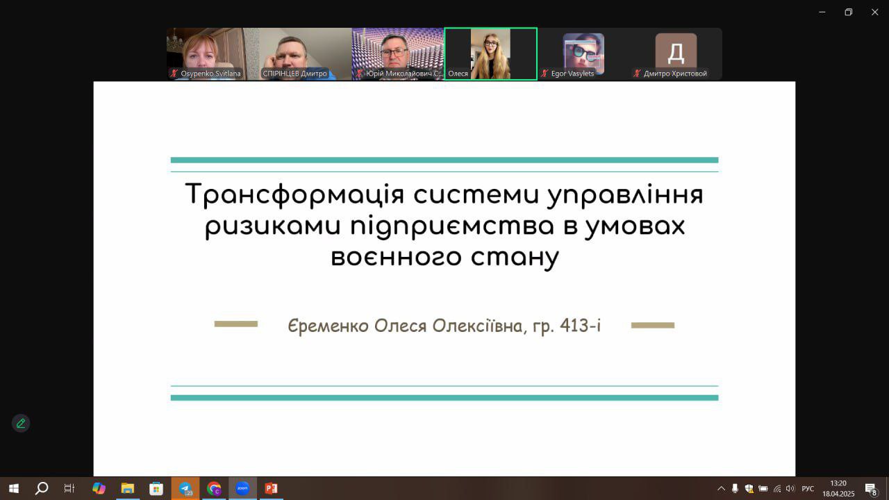 🏆 І місце посіла Єременко Олеся Олексіївна, здобувачка групи 413-і, з науковою роботою за темою: «Трансформація системи управління ризиками підприємства в умовах воєнного стану» (науковий керівник – к.е.н., доцент Захарова Н.Ю.).