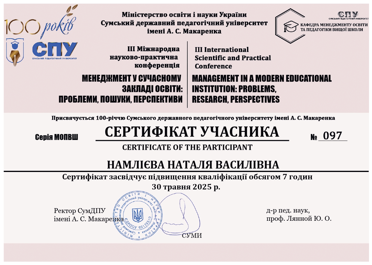 Факультет інформатики, математики та економіки > Намлієва Наталія Василівна Посада: доцент кафедри управління та адміністрування. Наукові ступінь і звання: кандидат економічних наук, доцент. В університеті працює з 2022 року.Наукові інтереси: інвестування, менеджмент та маркетинг, страхування, конкурентоспроможність підприємства. Посилання на наукометричні бази:ORCID: https://orcid.org/0000-0003-0122-6100 Документи про підвищення кваліфікації (стажування) Документи про підвищення кваліфікації (стажування)
