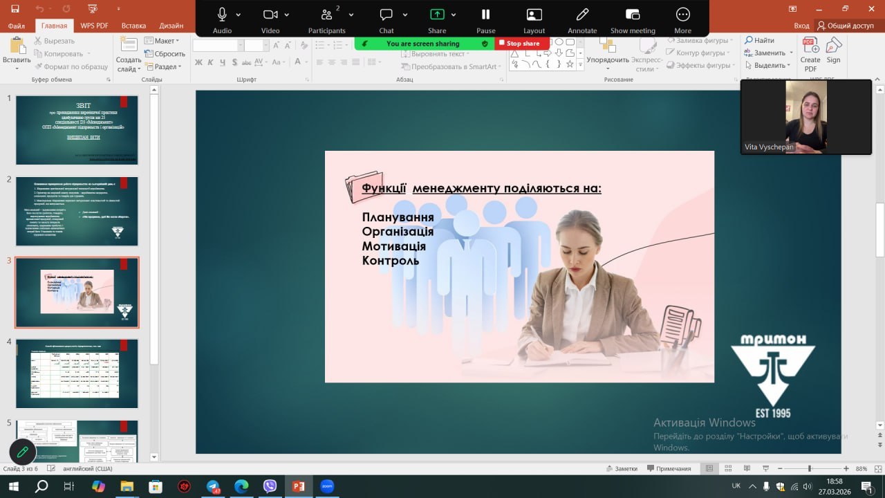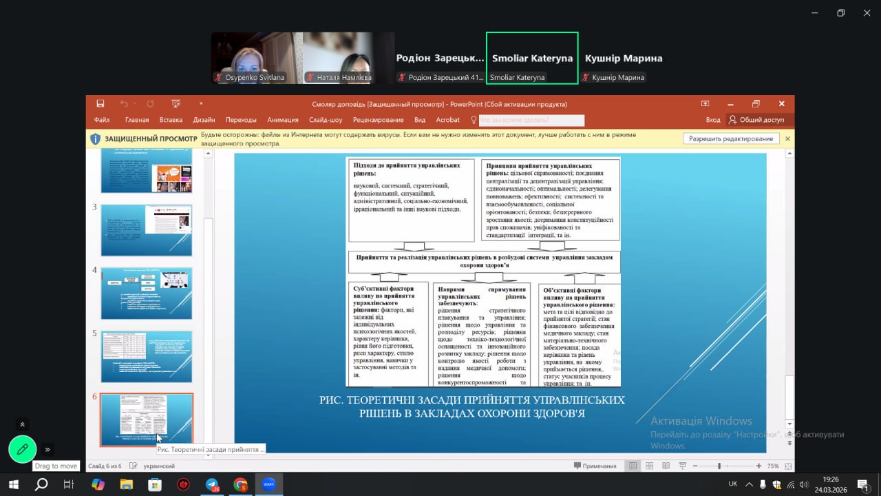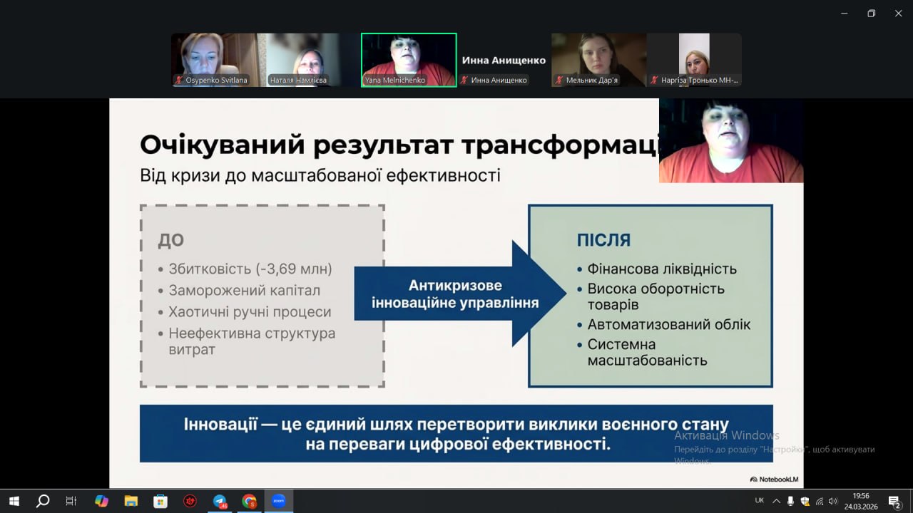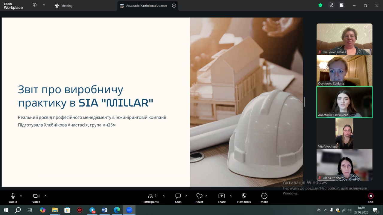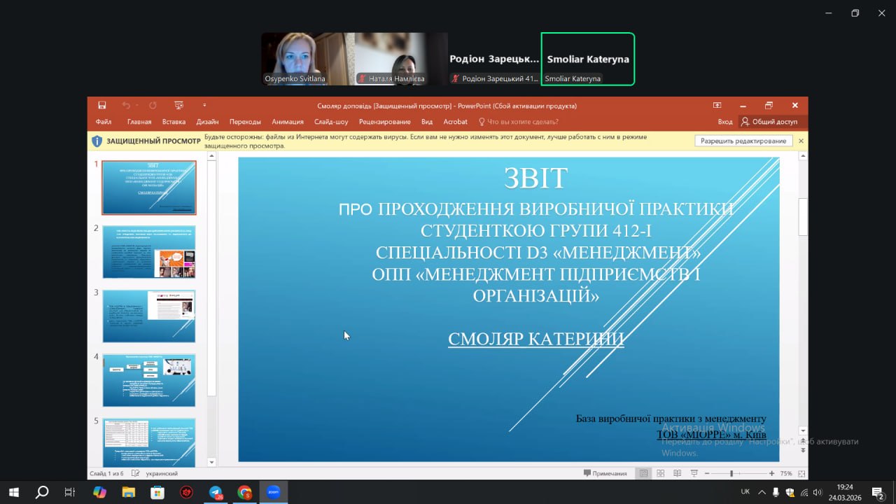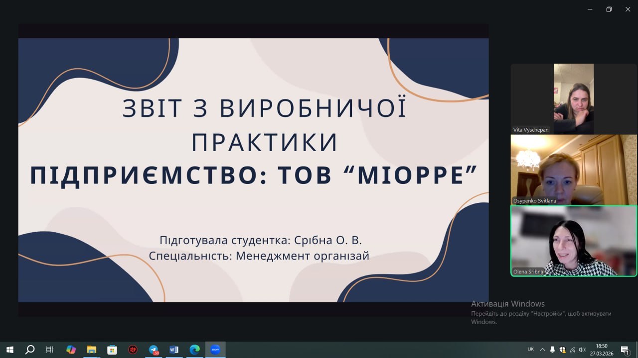 24 березня 2026 року на кафедрі управління та адміністрування відбувся захист звітів з виробничої практики здобувачами вищої освіти спеціальності D3 Менеджмент денної та заочної форми навчання факультету інформатики, математики та економіки. Керівником практики від кафедри управління та адміністрування в групі 412-і призначено канд.екон.наук, доц. Наталю НАМЛІЄВУ, в групах мн 22 та мн 22(2) призначено канд.екон.наук, доц. Світлану ОСИПЕНКО.