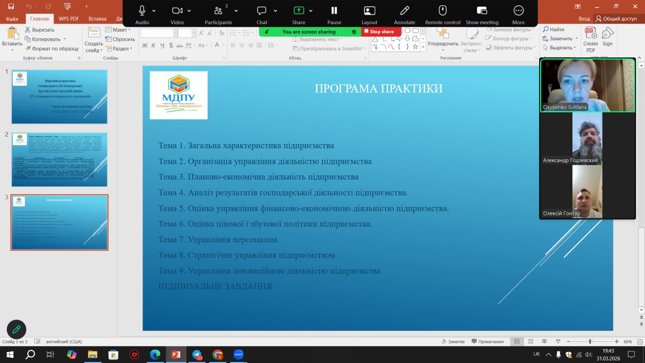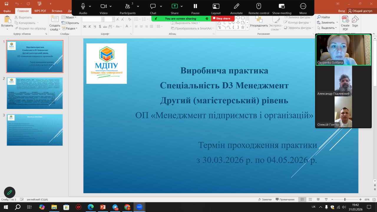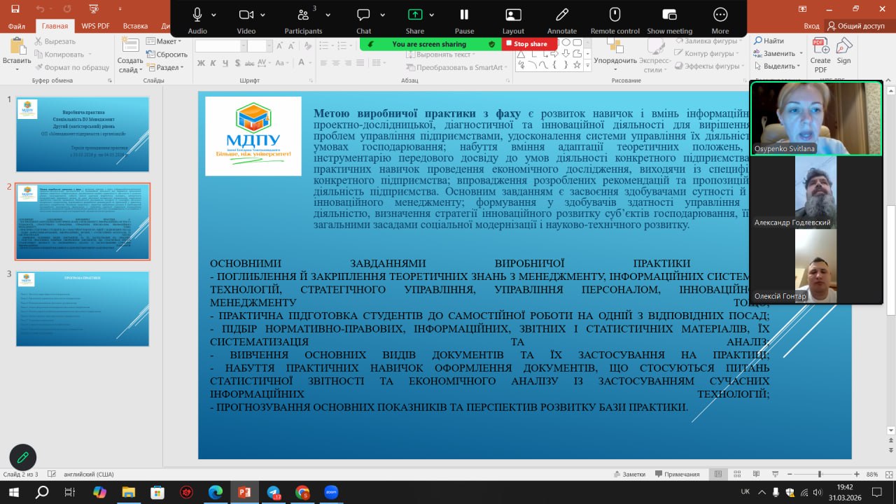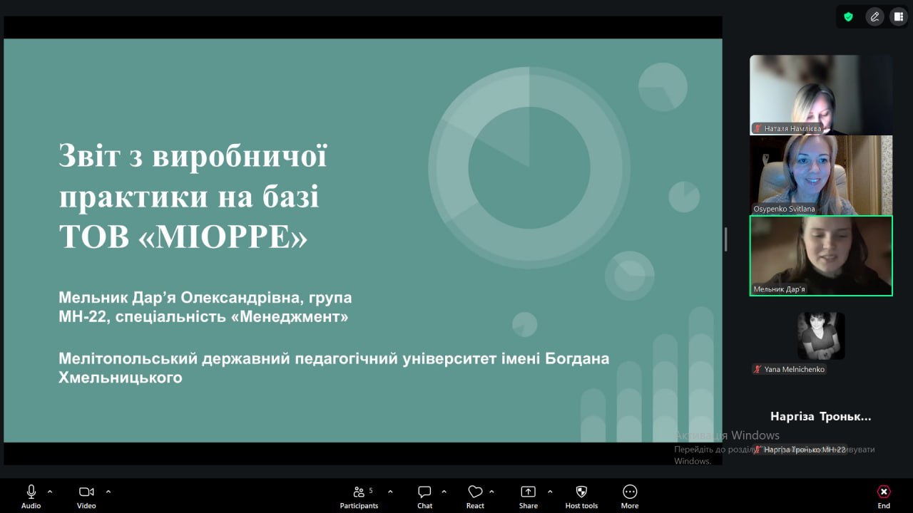 12 травня 2025 року на кафедрі управління та адміністрування МДПУ імені Богдана Хмельницького відбулася звітна конференція, присвячена підсумкам виробничої практики здобувачів вищої освіти денної форми навчання спеціальності 073 «Менеджмент» (група М414-і).