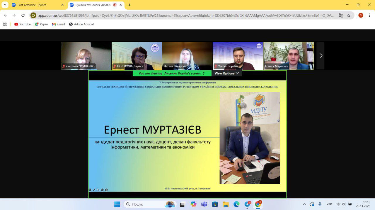 16–17 жовтня 2025 року викладачі кафедри управління та адміністрування та здобувачі спеціальності «Менеджмент» Мелітопольського державного педагогічного університету імені Богдана Хмельницького взяли участь у роботі XX Міжнародної науково-практичної конференції «Виклики та перспективи розвитку нової економіки на світовому, державному та регіональному рівнях», що відбулася на базі Запорізького національного університету.