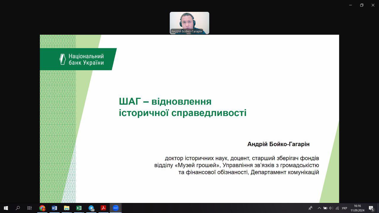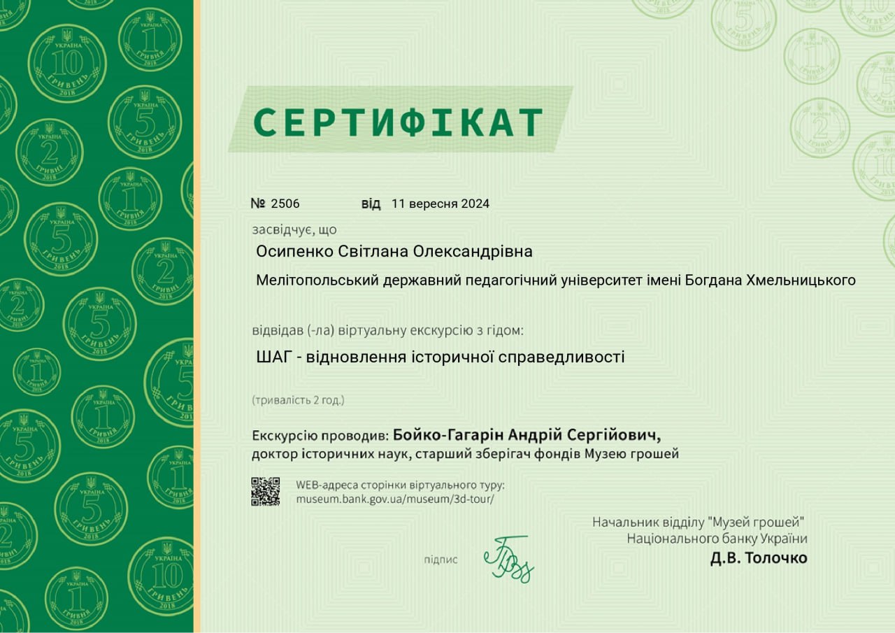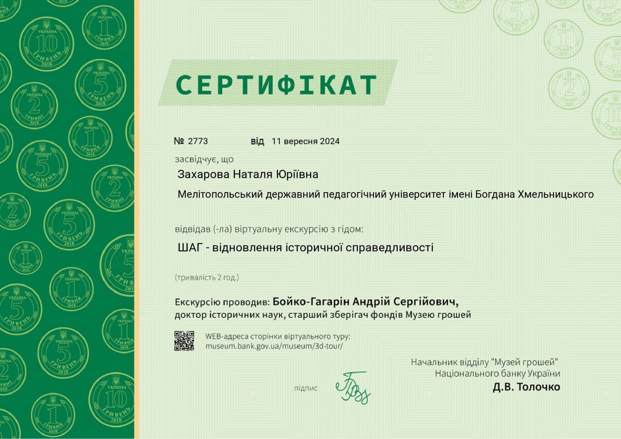 11 вересня 2024 року викладачки кафедри управління та адміністрування МДПУ імені Б. Хмельницького Наталя Захарова та Світлана Осипенко долучилися до вебінару для педагогів на тему «ШАГ: відродження історичної справедливості», що організований командою Музею грошей Національного банку України.